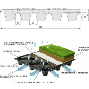 GIARDINI PENSILI MODI (3 pezzi per 1 mq) Prezzo al pezzo Gli innovativi MODÌ h 5 cm – h 9 cm sono stati creati per un triplice utilizzo, oltre alle soluzioni dei vespai aerati e della protezione dell impermeabiliz-zazione dei muri contro terra, si propone anche per essere utilizzato nella realizzazione dei giardini pensili. Il Giardino Pensile MODÌ è un efficace strumento che consente di migliorare il benessere ambientale nelle nostre città in quanto: • Apporta benefici climatici • Favorisce un utile contributo alla regimazione idrica in quanto accumula, trattiene e restituisce in percentuale ridotta l acqua all ambiente • Abbatte l inquinamento acustico proveniente dall esterno • Migliora l aspetto visivo delle nostre città, rese sempre più cupe dal troppo utilizzo di cemento. Inoltre, con il Giardino Pensile MODÌ si abbattono notevolmente i costi di manutenzione in quanto l intera copertura è protetta dai raggi diretti del sole, dalle intemperie e dagli sbalzi di temperatura apportati dai cambi di stagione, aumentando così la durata della vita del tetto stesso e costituendo una eccezionale protezione termica. CAMPI D IMPIEGO - Parcheggi, stabili di ogni genere, per automezzi in aree pubbliche, private, commerciali, sportive, industriali, ecc. - Camminamenti, vialetti, strade, cortili e piazzali. - Consolidamento e protezione delle scarpate. - Stabilizzazione degli argini e del fondo dei canali. - Piazzali di rimessaggio roulottes ed elicotteri. - Ai margini delle autostrade (minimizzando anche l’impatto ambientale). - Ai margini delle rotaie dei treni o filobus. - Aree gazebo, barbecue. DIMENSIONI 3 pezzi per 1mq Altezza : 50 mm : 600 x 600 x 50 opp. 90 mm : 600 x 600 x 90 Superficie totale piedi pilastrini (d appoggio) : 50 mm : 1.240 cmq/mq - 90 mm : 609 cmq/mq Resistenza a compressione : 50 mm e 90 mm oltre 10.000 kg/mq Riserva idrica : 50 mm 14 lt/mq - 90 mm : 18 lt/mq Potere drenante (con T.N.T + 20cm di terriccio) 50 mm : 1.300 lt/mq h - 90 mm : 1.300 lt/mq h