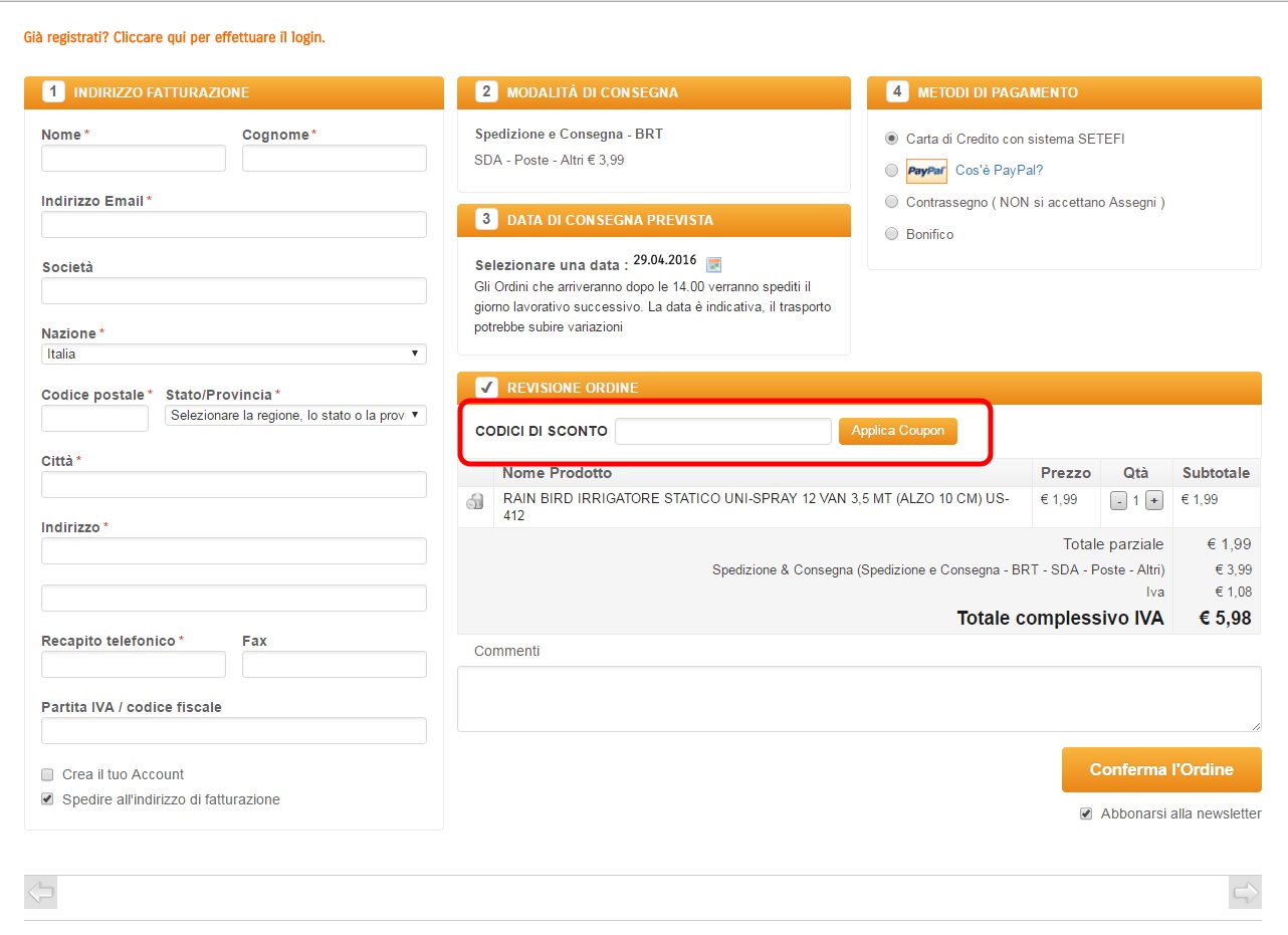 - E possibile utilizzare un codice COUPON inserendolo nell'apposito spazio (vedi Fig.5) per usufruire delle varie offerte che condividiamo mefiante email oppure newsletter come trasporto gratuito (oltre un certo importo, sconto sulla merce ecc.)